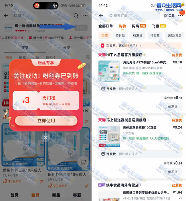 2.复制下方口令 淘宝打开 加购 点击店铺 顶部 右侧 关注有3元券 购买棉签即可