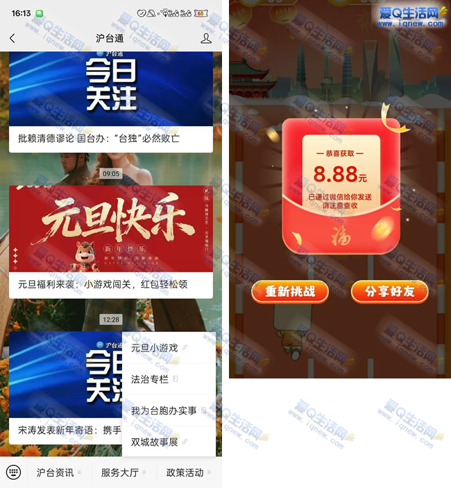微信搜【沪台通】公众号-底部【政策活动】-元旦小游戏-160分抽红包 不中反复