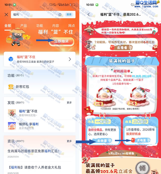 浦发APP-首页搜【福利蓝不住】下拉至【装满我的篮子】-一号篮子+二号篮子-去收蛋-页面上有很多基金-任意选择一个购买1元 基金-达标之后 2月5号11点开奖