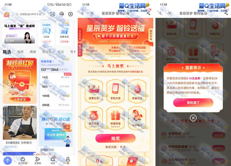 亲测2.16元话费秒到 电信星辰贺岁抽话费 ...