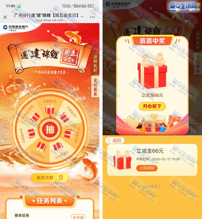 广州建行用户抽立减金 反馈66元立减金