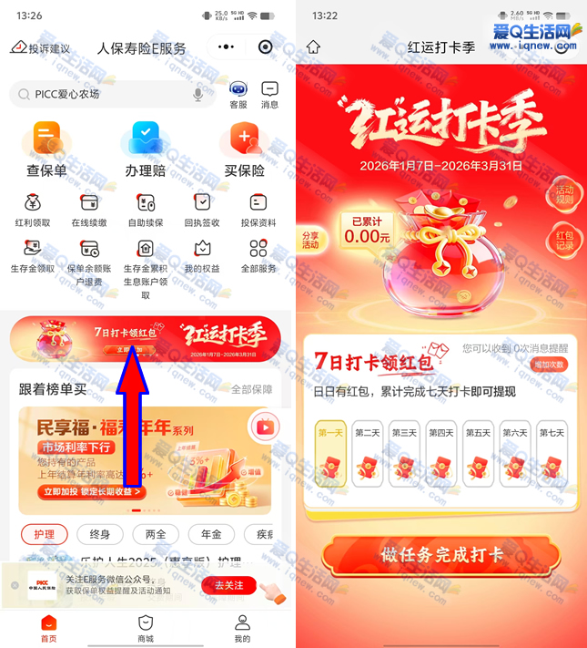人保寿险7日打卡领最高9.6元现金红包