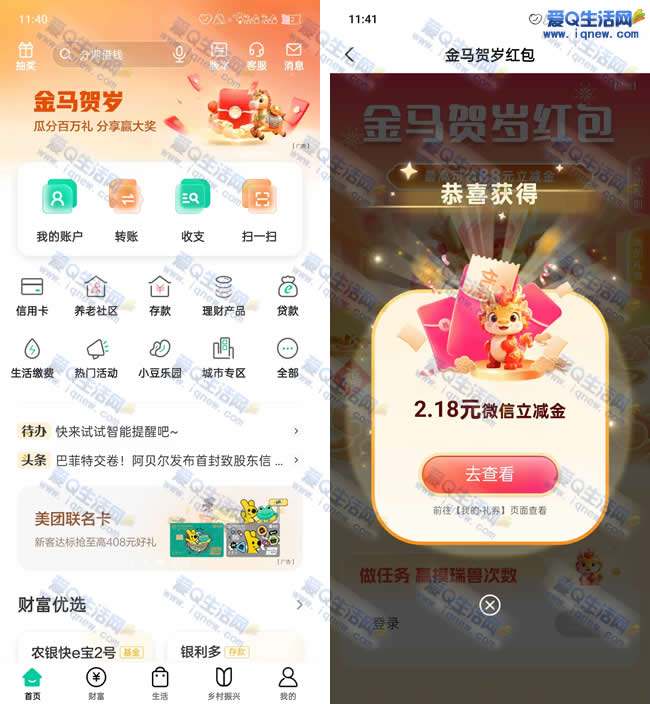 江西农行金马贺岁抽奖 亲测2.18元立减金 ...