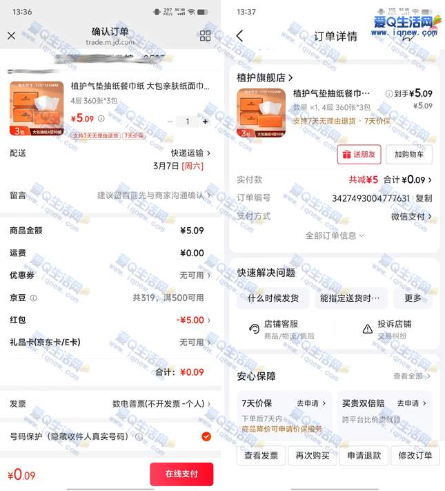 亲测5元无门槛红包秒到,红包到账京东APP,拿到红包的可以0.09元买3包抽纸